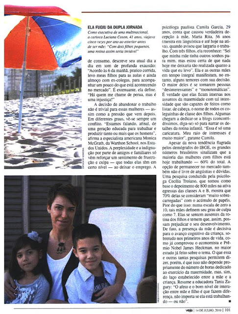 A revista Veja, em sua edição de 14 de Julho passado, publicou uma matéria sobre mulheres que estão saindo dos seus empregos por amor às suas famílias. É interessante observarmos a satisfação destas mulheres em priorizarem a educação dos seus filhos e percebermos que, do ponto de vista bíblico, este é o melhor caminho mesmo. Confira abaixo a reportagem completa. (clique na imagem para ampliação)
