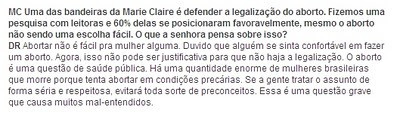 Preocupada com sua recente queda nas pesquisas, ontem a candidata Dilma reuniu padres e pastores para “negar já ter defendido a interrupção da gravidez”. A candidata disse as seguintes palavras: “Eu, pessoalmente, sou contra o aborto e considero a questão como de saúde pública”. Posição diferente da que declarou à revista Marie Claire, em Abril de 2009, quando não era candidata à presidência da República. Veja abaixo: